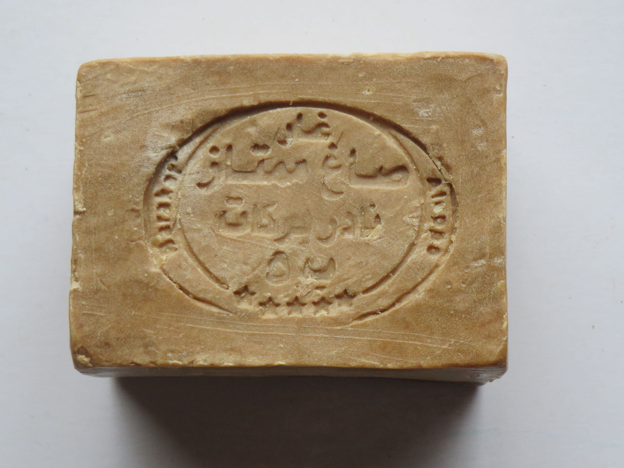 引き出しの奥から以前何かを買ったときにもらったオリーブ石鹸が出てきました。裏に「原産国シリア」とあります。オリーブオイルとローレルオイルを含有し、すべて手作りだと書いてあります。表面に刻印してあるのはアラビア文字のようです。