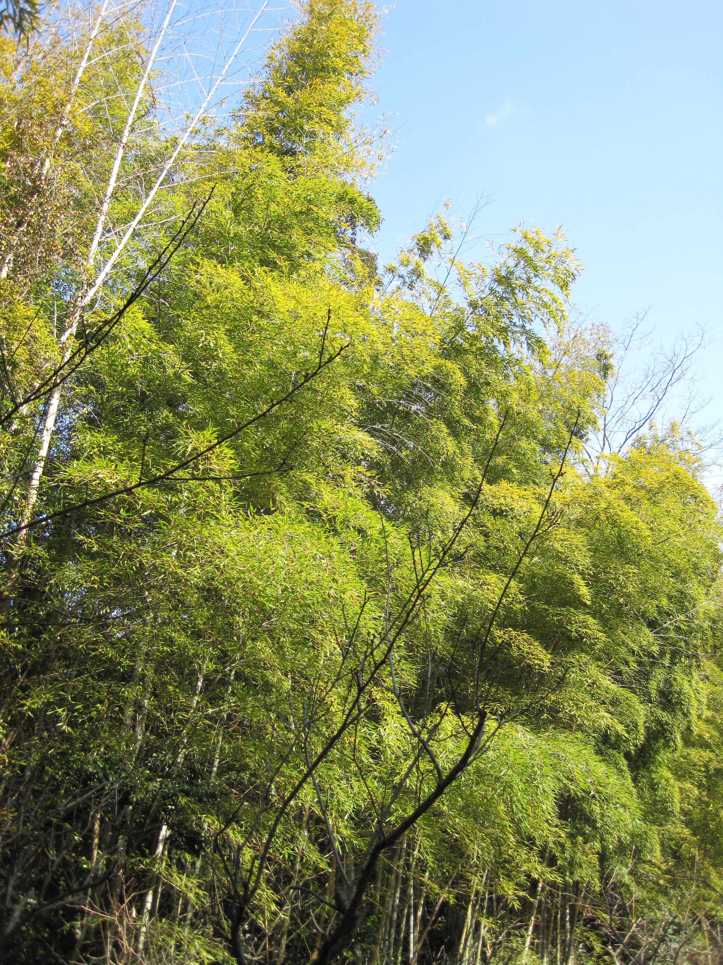 落葉が途切れるとヤブツバキの林となり、そこを通り抜けると本丸跡に出ます。本丸跡からは北側の展望が開け、遠く雪化粧をした山が見えました。山城跡の山は例外なく素晴らしい展望に恵まれています。往時には四方をぐるりと睥睨できたでしょう。本丸跡には何本かのヤマザクラの木があり、お花見をするのにもいいだろう、と思いました。