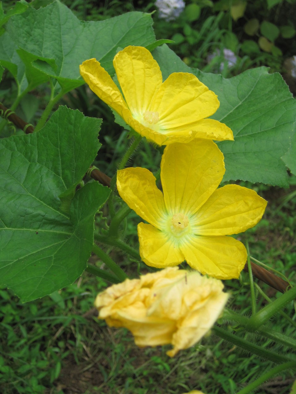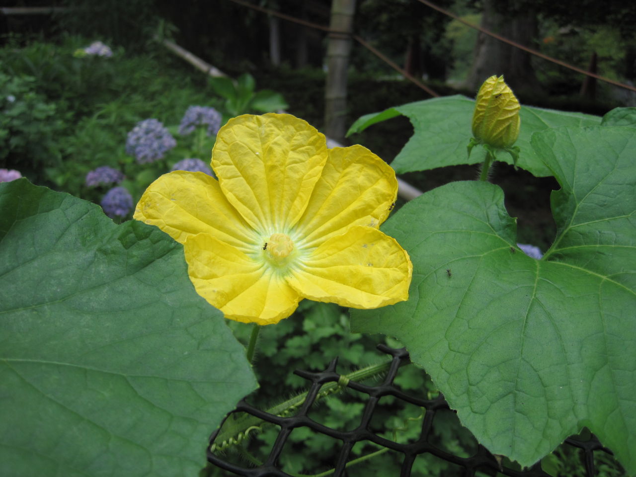 四日ぶりに増位山へ散歩に行きました。わずか四日ですが、アジサイ類はほぼすべて最盛期を終え、蛇ヶ池ではハスが咲きだしていました。ヘチマは一週間ほど前からアジサイの花壇の前で咲いています。大きな黄色い花を次々とつけ、そこに蟻がきています。