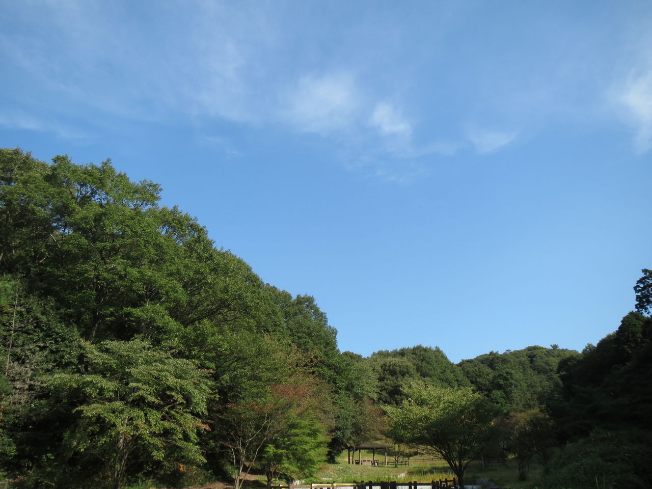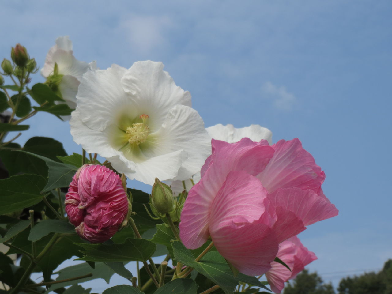 スイフヨウはフヨウの園芸品種です。花の色が朝は白、午後はピンク、夕方には紅色に変化するので酒に酔ったことに見立ててスイフヨウと呼ばれます。赤と白の花がいっしょに咲いていてその彩が美しいです。午前中は晴れていましたが、午後から少し雲が出てきました。