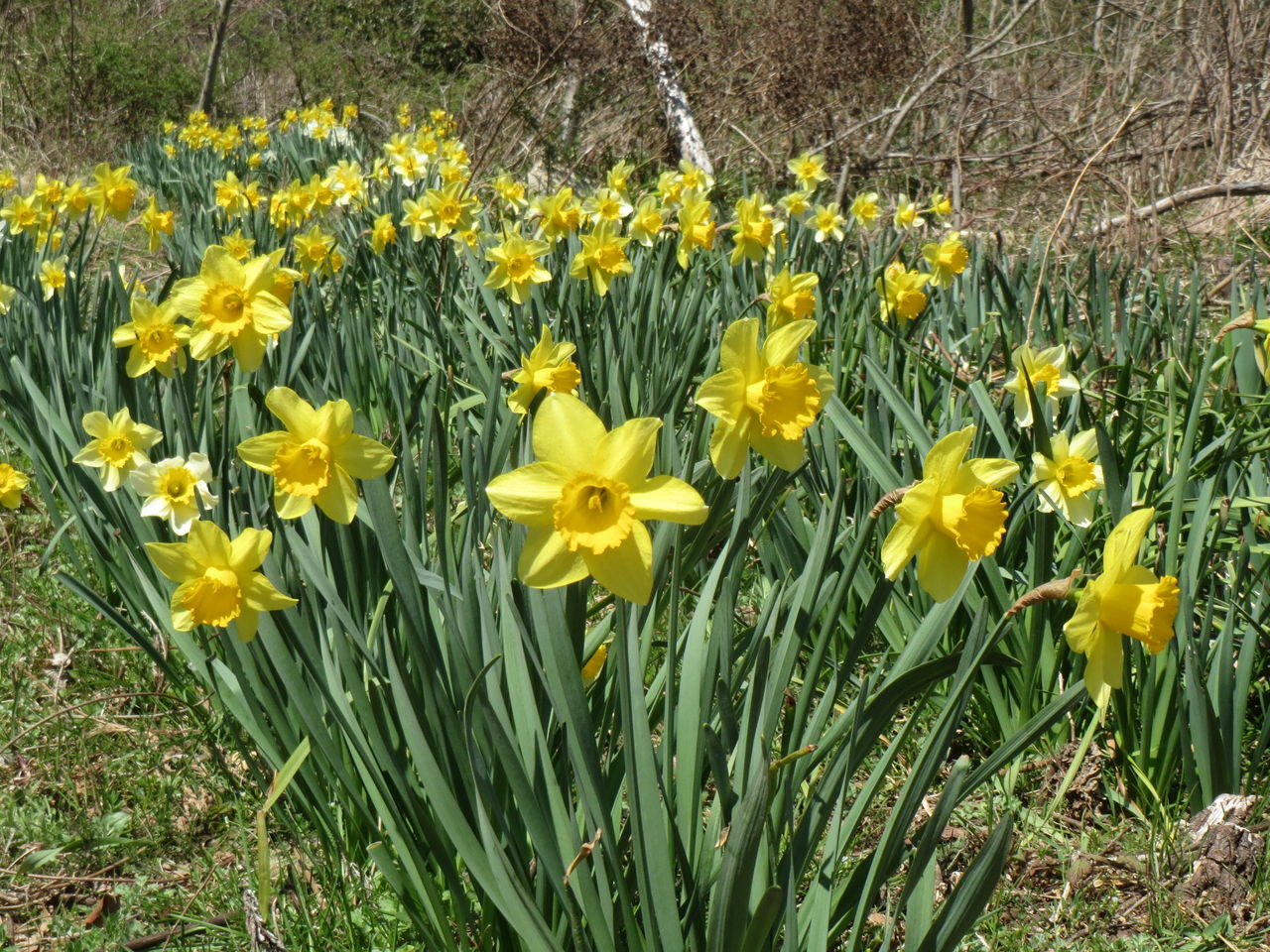 増位山ドライブウェイの傍らに喇叭水仙が植えられています。喇叭水仙はヒガンバナ科の多年草です。一茎一花で花心の副花冠が花弁と同じ長さかそれよりも長く、喇叭の形をしています。