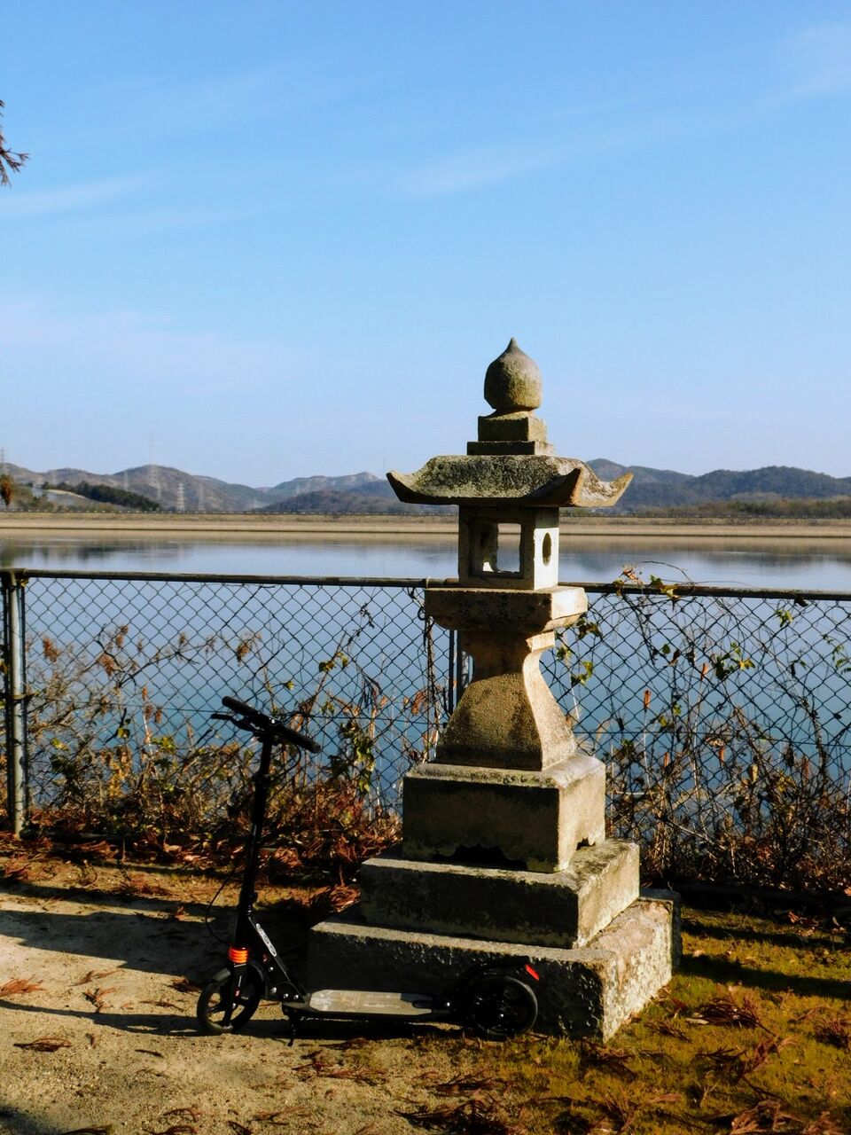 2020年12月29日 歳末や弁財天に人ぽつぽつ ◆歳末 平荘湖の南岸には弁財天神社があります。平荘第一ダムのすぐ手前に鎮座しています。ちょっと中に入る感じなので気づかない人もあるでしょう。このあたりは古墳も多かったようで、家型石棺の蓋が境内の藤棚の横に残っています。 本殿の隣には鴨塚と慰霊碑がたっています。鴨塚とはここに渡ってきて帰れずに命を落とした鴨を弔ったものでしょうか。慰霊碑は昭和42年建立とありました。その前年、遺跡の発掘調査中に水難事故で亡くなった当時20歳の龍谷大学の学生の冥福を祈って建てられたものです。