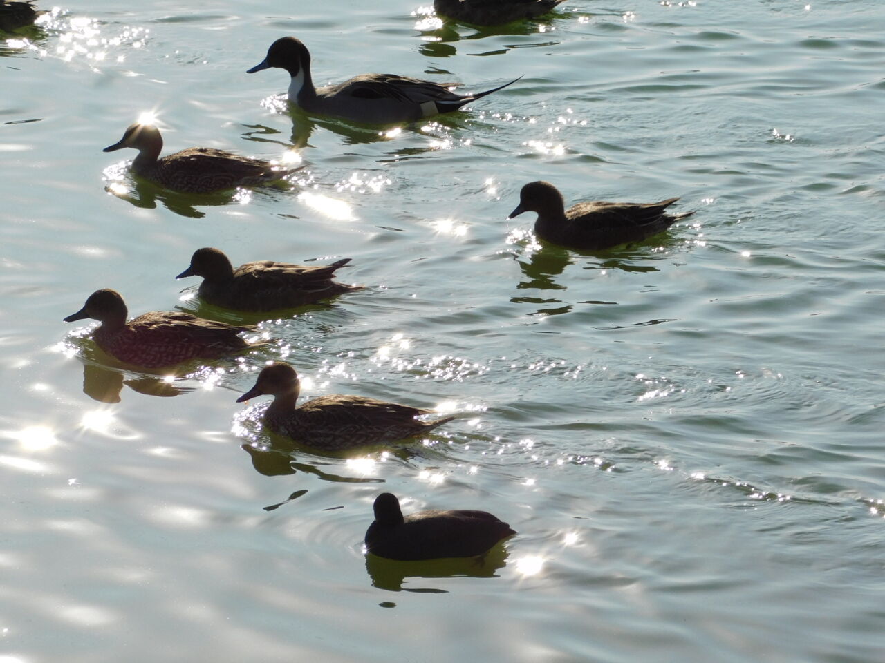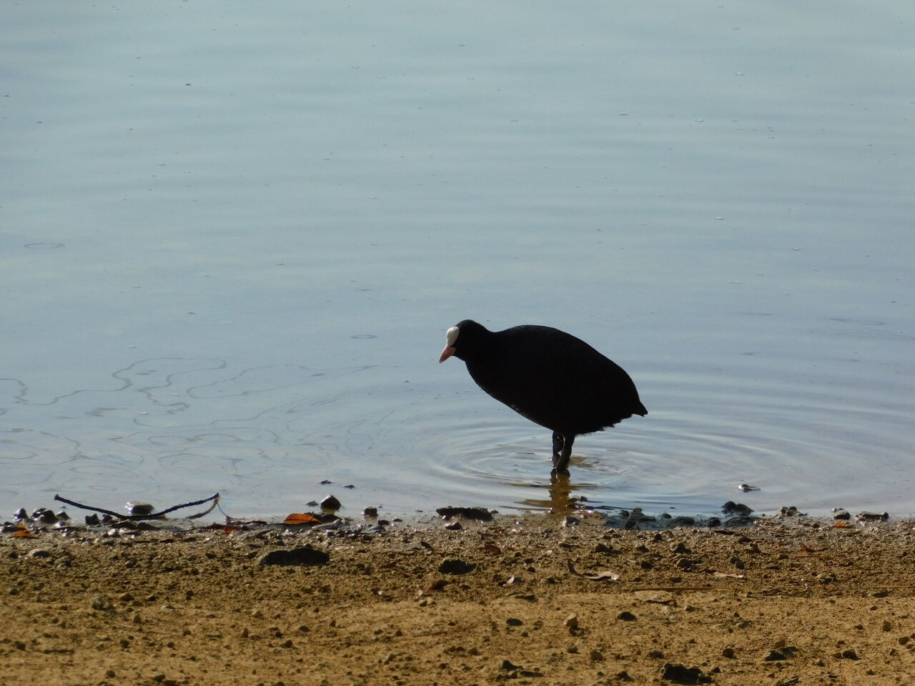 2020年12月29日 水鳥やさざ波たてて渚を歩く ◆水鳥 別の場所でオオバンが餌を探して歩いていました。オオバンはクイナ科でユーラシア大陸の温帯で広く繁殖します。日本では主に関東より北で夏に繁殖し、冬には南下して越冬します。全身が黒く額の白さが目立つので見分けやすい野鳥です。