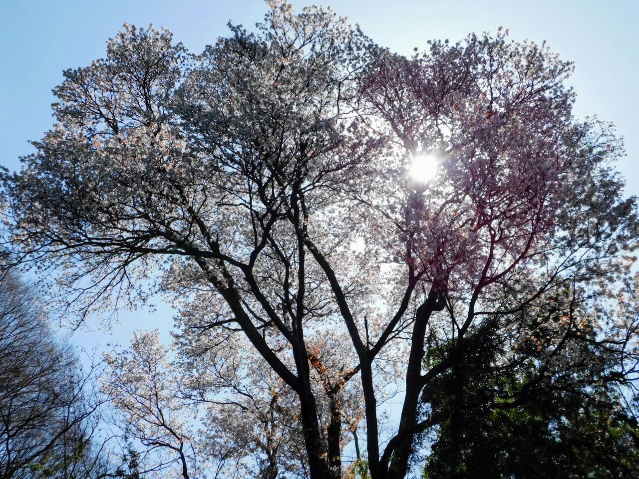 2021年03月27日 日輪を隠す大樹の山桜 ◆山桜 増位山梅林にあるヤマザクラの大樹が満開になっています。梅林は山の斜面にあり、ヤマザクラも斜面に根を張っています。そのため下から見上げるとはるか高いところで花が咲いています。お昼どきでちょうど花の後ろから日差しがやってくる恰好でした。このように迫力のある花はこの場所でしか見られません。