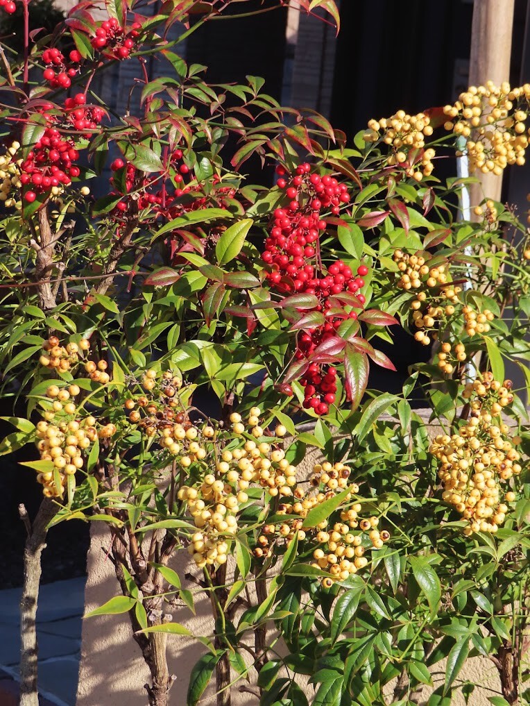 紅白の実南天揃う玄関