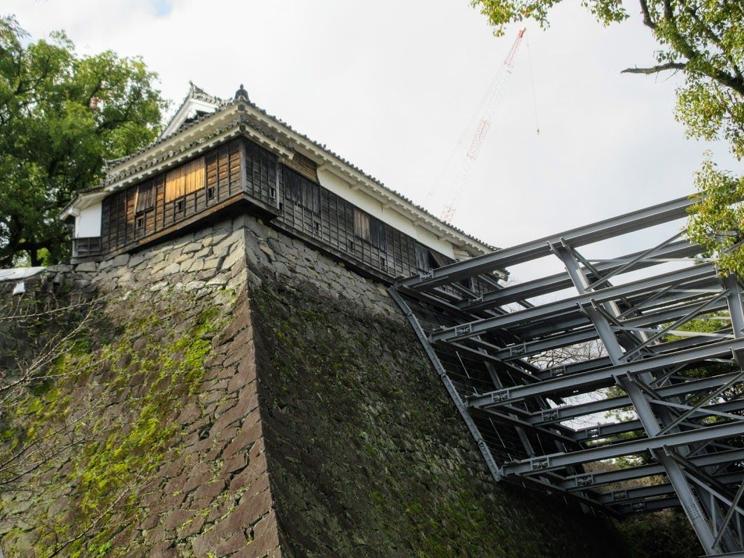 2019年03月04日 鉄骨が支える石垣春淡し ◆春淡し 熊本城の現在の見学コースは、城の西側にある二の丸駐車場から北に向かって出発し、二の丸広場前を通って戌亥櫓で東へ曲がり、加藤神社に詣でた後、県道303号に出て道なりに南へ進みます。その後、坪井川を渡って川沿いの道を馬具櫓前まで歩く形になっています。 平櫓は天守の北東を守る一階建ての櫓で、高さ18mの石垣の上に建っています。地震により石垣の土台が大きく膨らみ建物も損壊しました。今は崩落を防ぐために巨大な鉄骨が石垣を支えています。 カテゴリなしの他の記事 タグ :#熊本城#平櫓 < 前の記事次の記事 > コメント コメントフォーム 名前 コメント 評価する リセット リセット 顔 星 投稿する 情報を記憶
