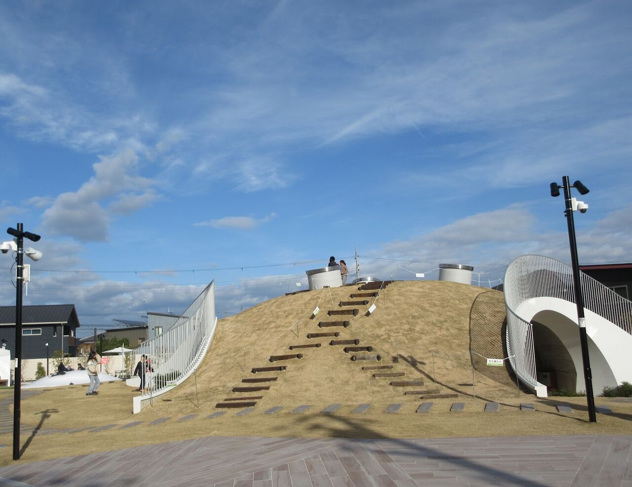 日曜日も「CAROHIMEPARK」へ立寄りました。公園の中央に登れる丘のような場所があります。下は空洞でぐるりと半円状に木製ベンチが据え付けられています。子どもたちが代わる代わるあがっており、私も登ってみました。