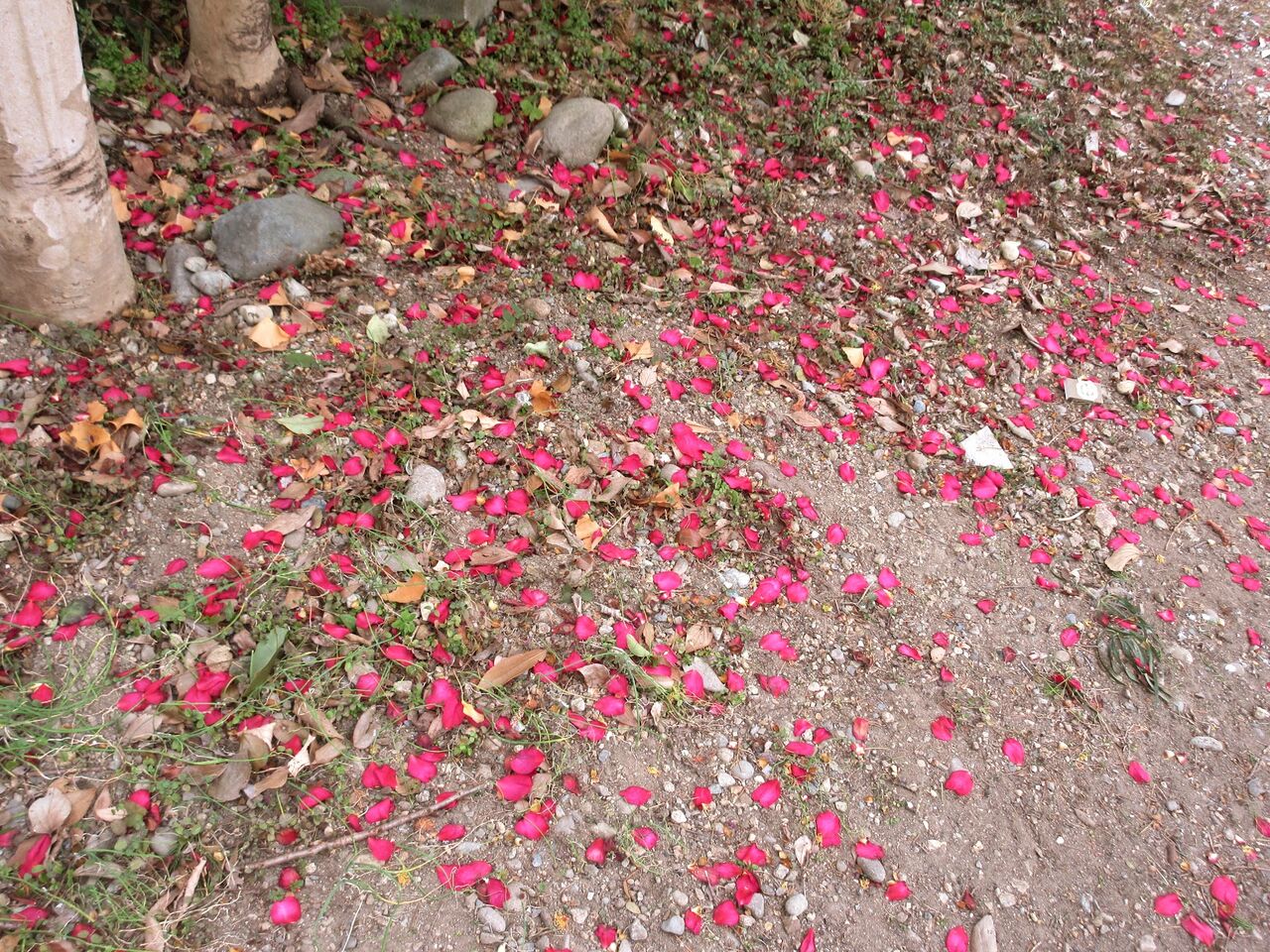 庭木として栽培されることが多いので、見上げるような大樹のサザンカはそれほど目にしませんが、散歩に行く病院の構内には背丈をはるかに超えるものもあります。それらの木々の根元には咲いて散っていった花びらが散りばめられています。