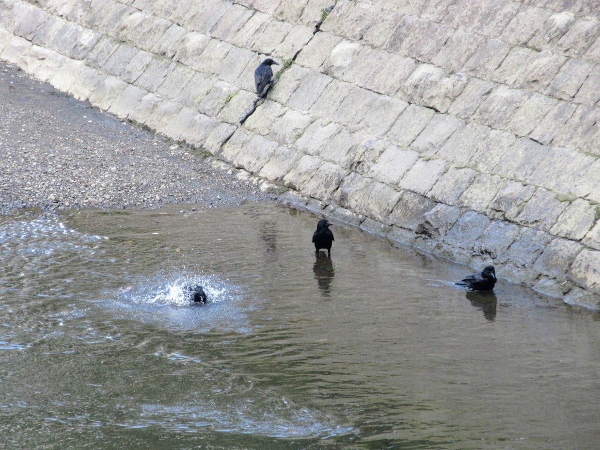 2019年03月04日 内堀に烏水浴びうららけし ◆うららか 厩橋を渡ると正面に熊本市役所があります。ここの14階からは熊本城全体が見渡せたそうですが、気づきませんでした。ただ、知っていたとしても、立ち寄るには時間的に厳しかったかもしれません。 正面の熊本信用金庫のビルに大きなくまモンが描かれているのが見えました。自治体のキャラクターではダントツのスターで、どこでもおなじみながら、あらためて熊本に来ているのだと思いました。熊本城の内堀の一部を形成する坪井川に沿って西へ歩いて行きました。暖かく川の中ほどで数羽のカラスが盛んに水浴びをしていました。「カラスの行水」と言いますが、実際にカラスが水浴びをしているのを見るのは初めてでした。 タグ :#くまモン#熊本城#坪井川