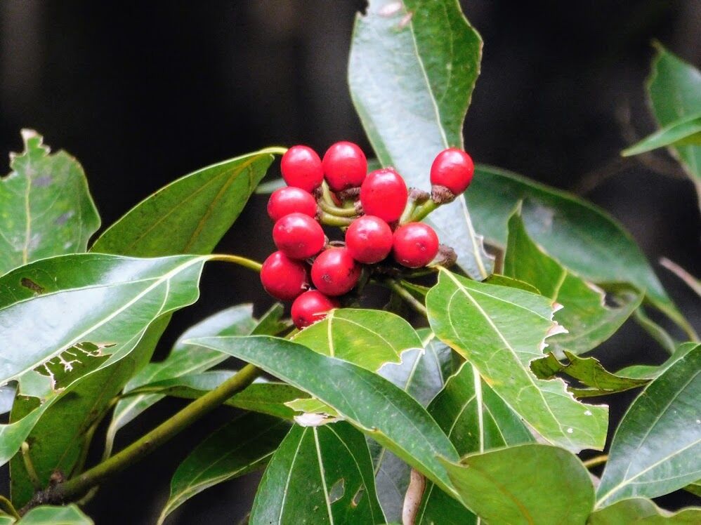 2019年11月22日 小雪のしろだもにあり花も実も ◆小雪 今日は二十四節気の小雪です。冬の二つ目の節気です。立冬の節気はまだ秋の名残が強かったですが、しだいに冬らしさが増してきます。日はすっかり短くなりました。 増位山随願寺境内の放生池の横にシロダモが生えています。シロダモはクスノキ科シロダモ属の常緑高木です。赤い実の横に白っぽいものが伸びていますが、これは花です。雌雄異株で、この木は実をつけているので雌株です。花の後にできた実は一年かけて熟し赤くなります。花と実を同時に見られるという珍しい木です。 タグ :#小雪#シロダモ