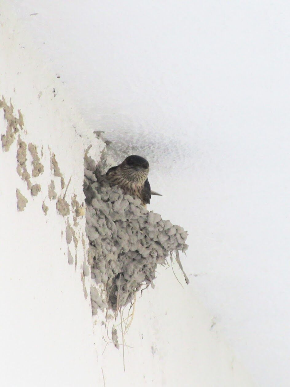 コシアカツバメがアパートの向こうの端に巣を作りました。そちらの巣はすでに完成しトックリ型の入口がこちらに向いているのが見えます。そういう向きに作るのかと思っていたら、最近もっと近くに別のつがいが巣を作り始めました。