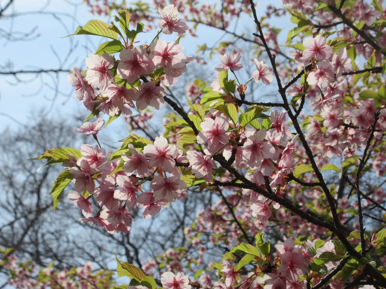 いこいの広場を歩いて行くと桜が何本も咲いています。ソメイヨシノとしては早すぎるので河津桜かと思いましたが、大漁桜という品種のようです。そのあたりでお弁当を広げている人たちの姿があり、私たちもそうすることにしました。