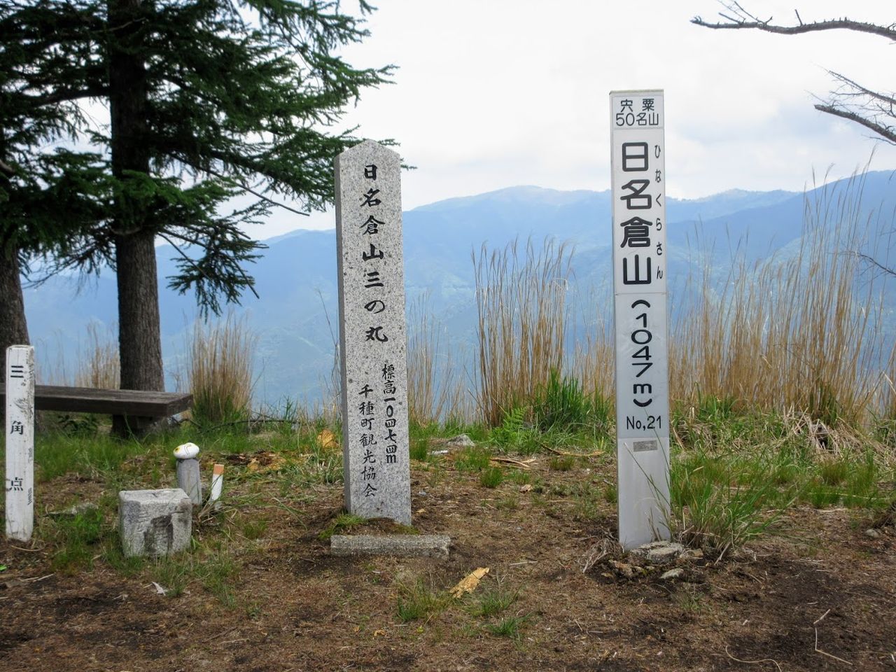 2019年06月07日 森尽きて立つ薫風の頂に ◆薫風 道は歩きやすく、コンスタントに高度が稼げます。しだいに、コナラやリョウブなども現われ、1時間ほど登ると、森が途切れて頂に出ました。まだ11時前で、頂にはほかに誰もいませんでした。一等三角点のそばに「宍粟50名山日名倉山」「日名倉山三の丸」との標識が立っています。兵庫県宍粟市千種町室から佐用町の奥海越を経由して登ってくるルートの途中に一の丸、二の丸という場所があり、それゆえの三の丸です。 頂は兵庫県と岡山県の県境になっており、宍粟市と佐用町との境界でもあります。頂の展望は抜群で、北に後山を中心とした兵庫と岡山県境の山々が見えました。 タグ :#日名倉山#兵庫100山#宍粟50名山
