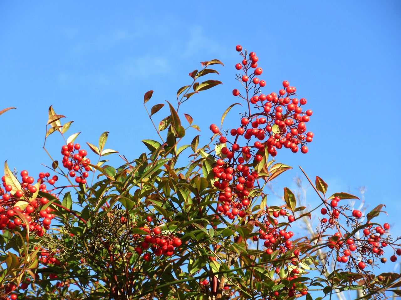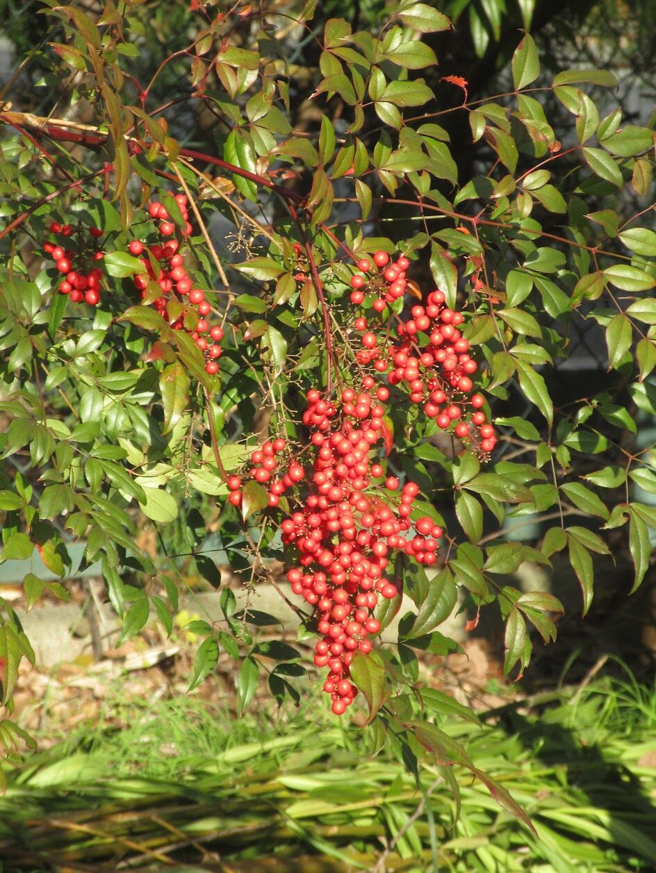 この赤い色は誘うのではなく警告としての赤だと言われています。ナンテンは自然落下し自家発芽で子孫を残します。赤い色はアントシアニンであり、冬の寒さや紫外線から守る保護色、抗酸化作用の可能性があるようです。