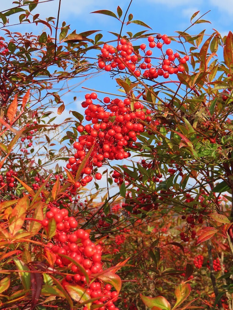 南天の実に赤さが加わってきました。冬に入り花が少なくなる中で庭や公園などを彩ってこの赤い色は目をひきます。赤い実をつける植物の大多数は、野鳥に食べて種を運んでもらうことを目的にしています。ヤマハゼ、ナナカマド、サンザシ、ソヨゴなどがそうです。