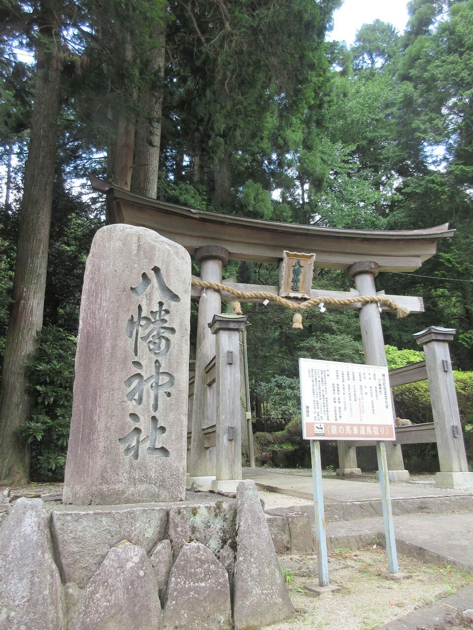 「楽や」のレジ前に案内があった猪篠八幡神社へ参拝に行きました。鳥居のすぐ横に車を停め、森に入っていくとすーっと暑さがひいていきました。ここの森は実に見事で参道には歴史を感じさせる杉の大木が並んでいます。