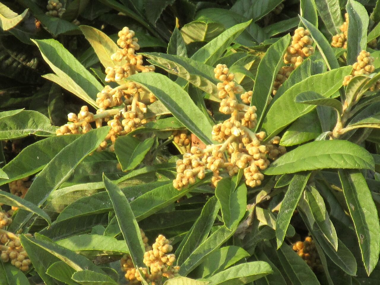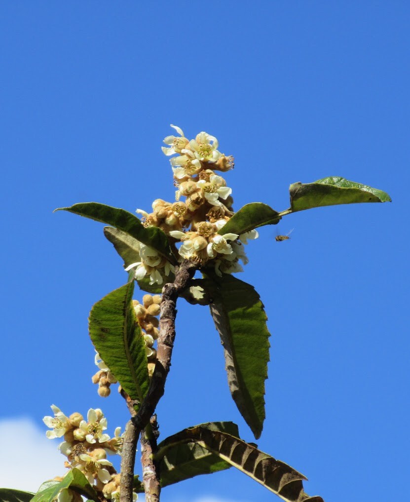 2025年11月21日 蜜蜂の繁く通いぬ枇杷の花 ◆枇杷の花 ビワはバラ科の常緑高木です。夏に琵琶の形をした黄橙色の甘い実がなります。花の時期は11月〜2月で、クリーム色がかった小さな五弁の花が開きます。花はアニスアルデヒドによる甘い芳香を放ち、花の少ない時期に虫たちを誘います。 見ている間にもミツバチがやってきました。花粉と蜜はミツバチの食料源となり、ミツバチはビワの受粉を助けます。 タグ :#枇杷の花