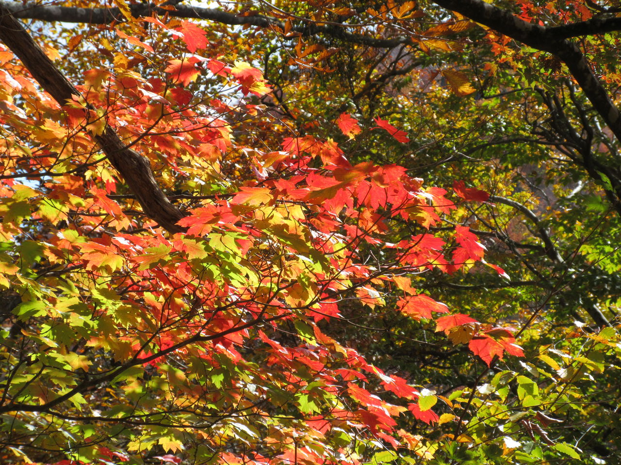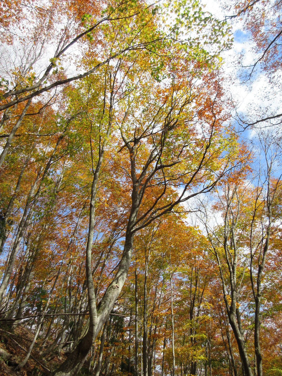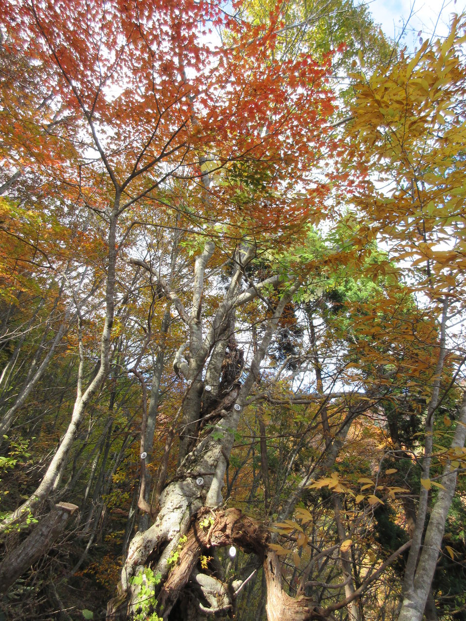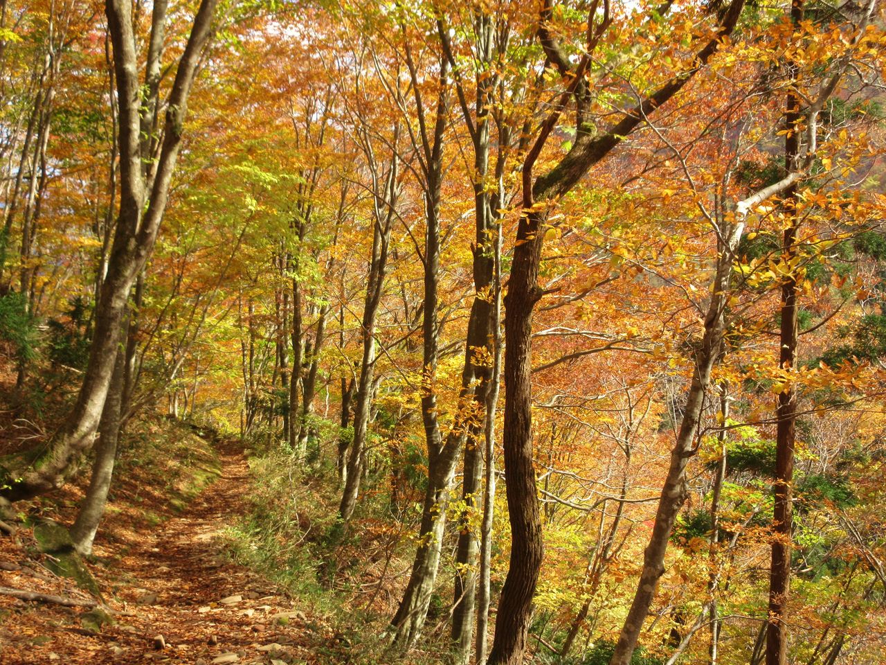 下山は東南方向に杉林の中をくだり、ブナの巨木が現れると神大ヒュッテです。左にコースをとり、東尾根をくだります。ベニドウダンなどツツジの群生地でこれらが紅葉し、とてもきれいでした。