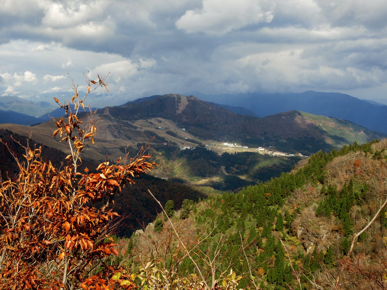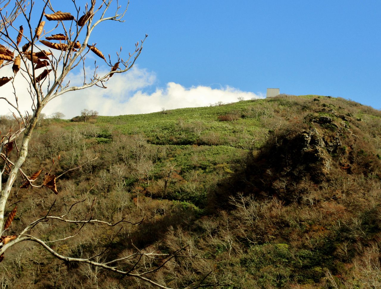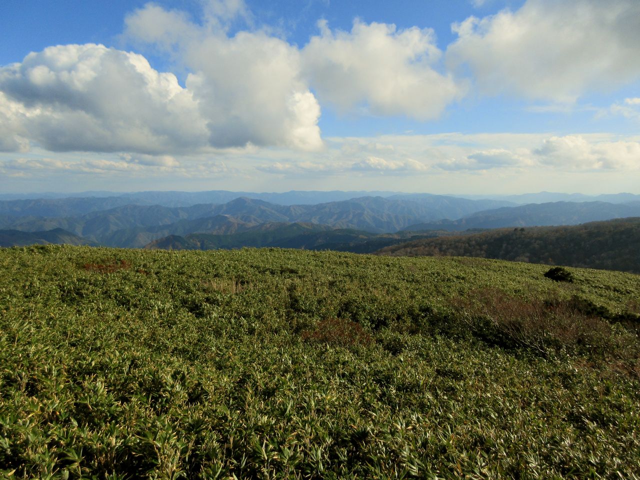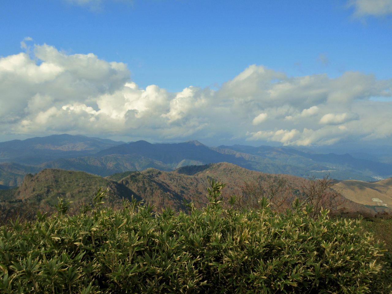 振り返ると鉢伏高原へと続く山並みが見えました。途中、鳥取方面へ下りるという人達に会いました。倉敷から来られたとのことでした。紅葉シーズンの週末なら大勢の登山者に会ったでしょうが、今日はウイークデイなので、静かな山歩きでした。