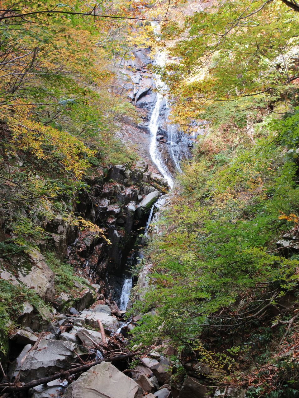 登山道は流れに沿っていますが、豪雨の影響でこちらもあちこち壊れており、川のそばの岩に赤ペンキで矢印がつけられ、臨時の登山道になっていました。コナラ、クヌギなど黄葉する木々が多く登山口からしばらくの間は黄葉の中を登って行きました。