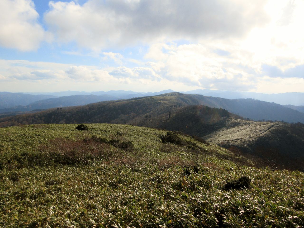 晩秋の陽が山上の笹原に