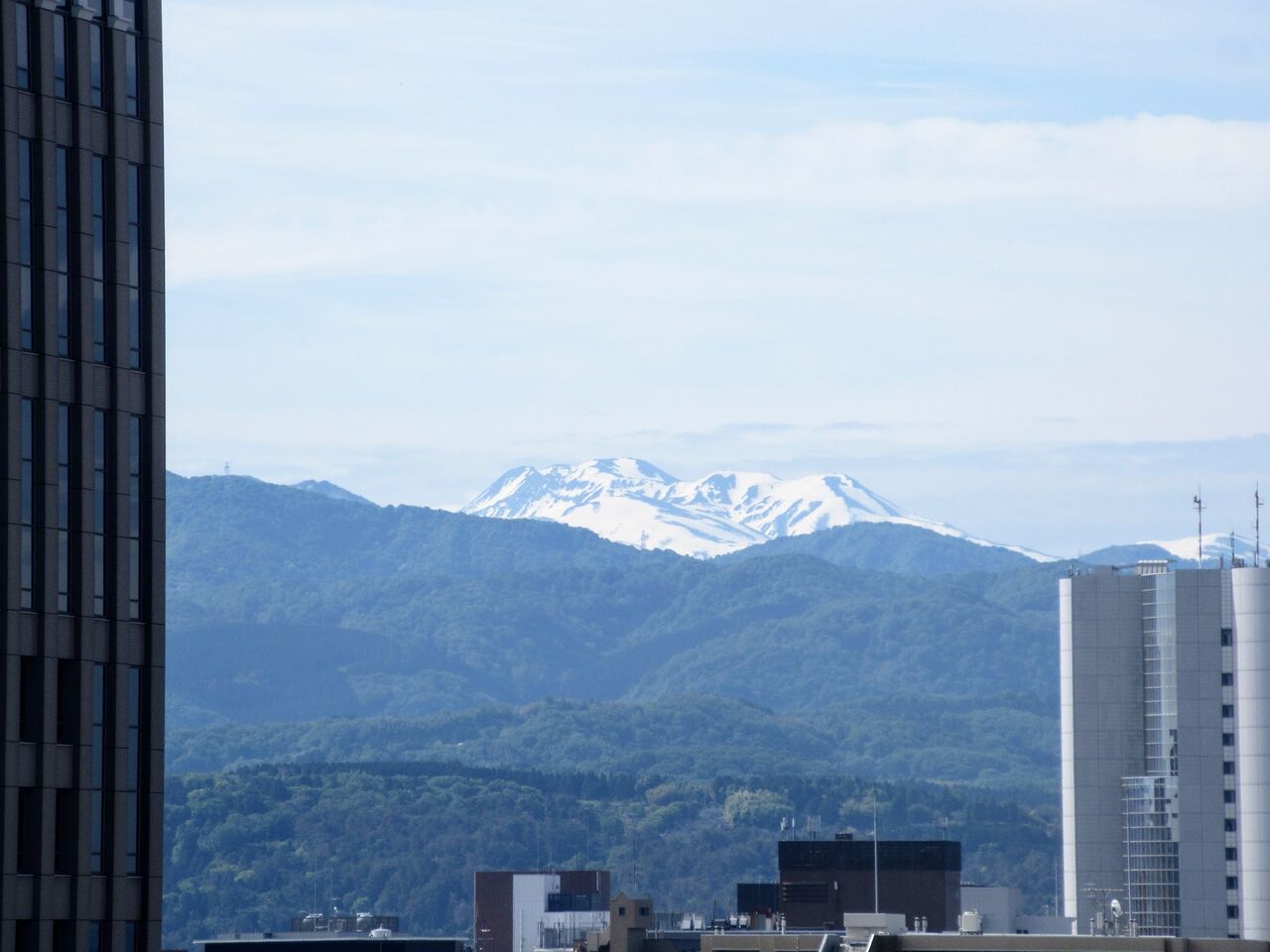 金沢では駅近くの「ホテル金沢」に宿泊しました。窓からビルの向こうに雪を被った山が見えました。白山です。石川と岐阜の県境にそびえる標高2,702mの活火山です。富士山、立山とともに三大霊峰として古くから信仰の対象になってきました。他の地域で雪が消えた今でも「白い山」は一目瞭然です。