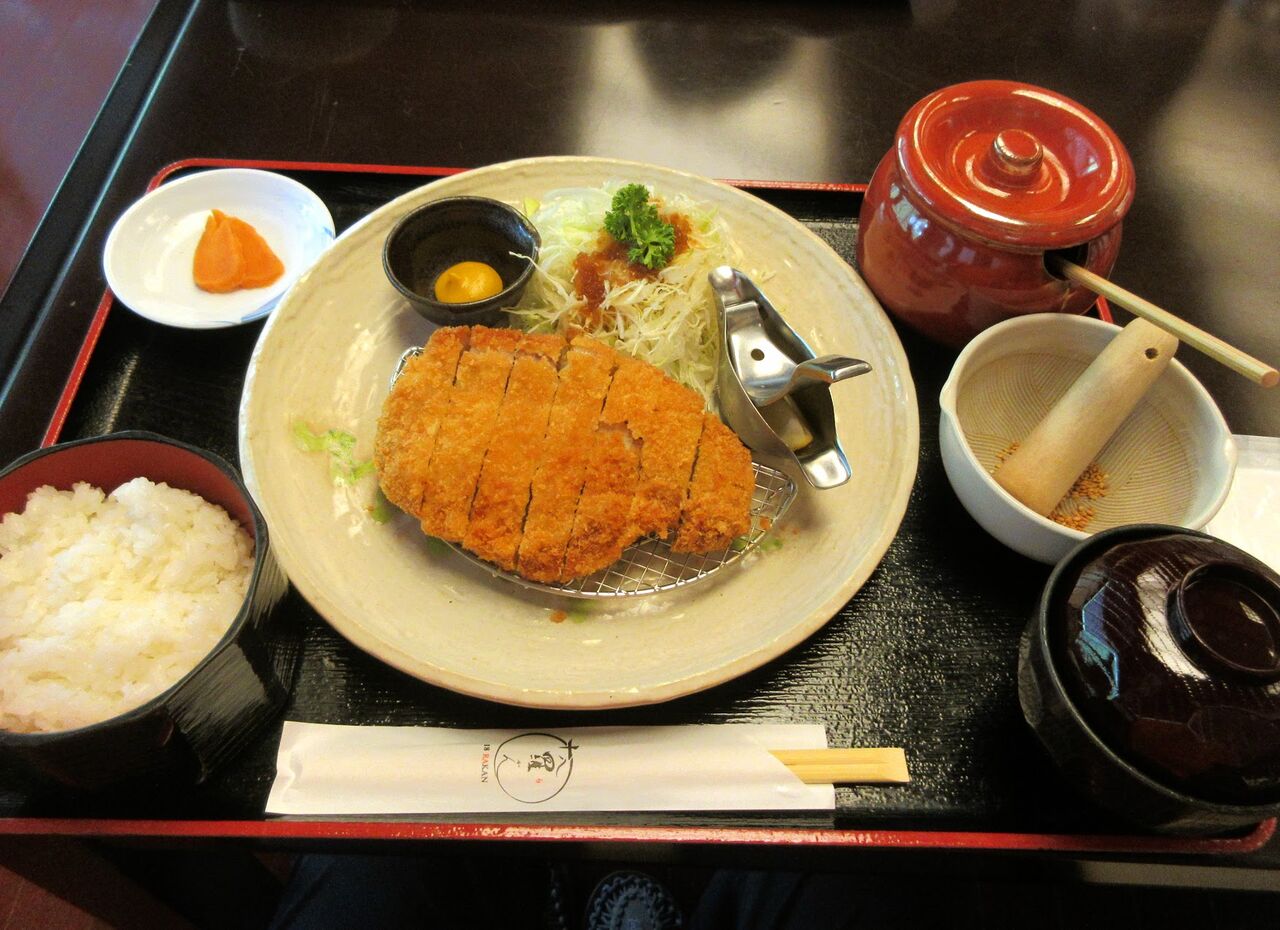 今日は行事がおこなわれているらしく広島、石川、名古屋、岐阜、飛騨、八王子など全国各地の車がずらりと並び、「奉仕」のゼッケンをつけた人たちが大勢食事しています。とんかつ定食は肉がやわらかくジューシーでとても美味しかったです。