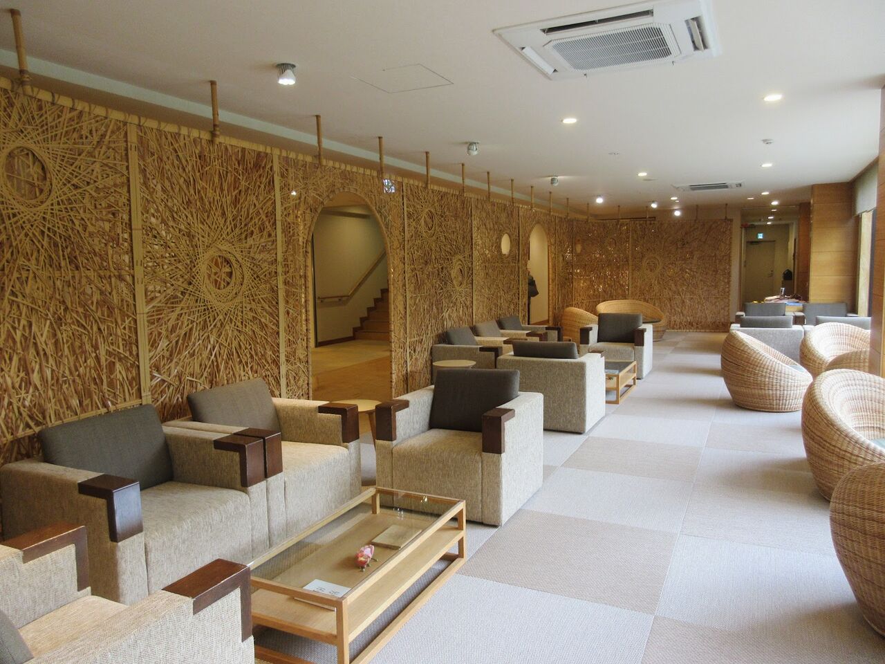 床はすべて畳でスリッパを履く必要がなくありがたかったです。玄関ホールのしきり壁は「やたら編」という手法で編まれています。部屋にもこの編み方の竹のすだれがありました。