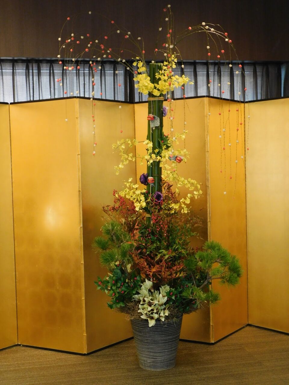 2023年01月03日 餅花の揺れが映りし金屏風 ◆餅花 小晦日から元日にかけて宿泊したホテルのロビーにはお正月の飾り付けがされていました。松、竹を中心に、千両、万両、南天、小さな獅子舞などが飾られ、トップには餅花が挿されています。餅花は柳の枝に丸めた餅を飾り、五穀豊穣を祈るものです。 タグ :#餅花